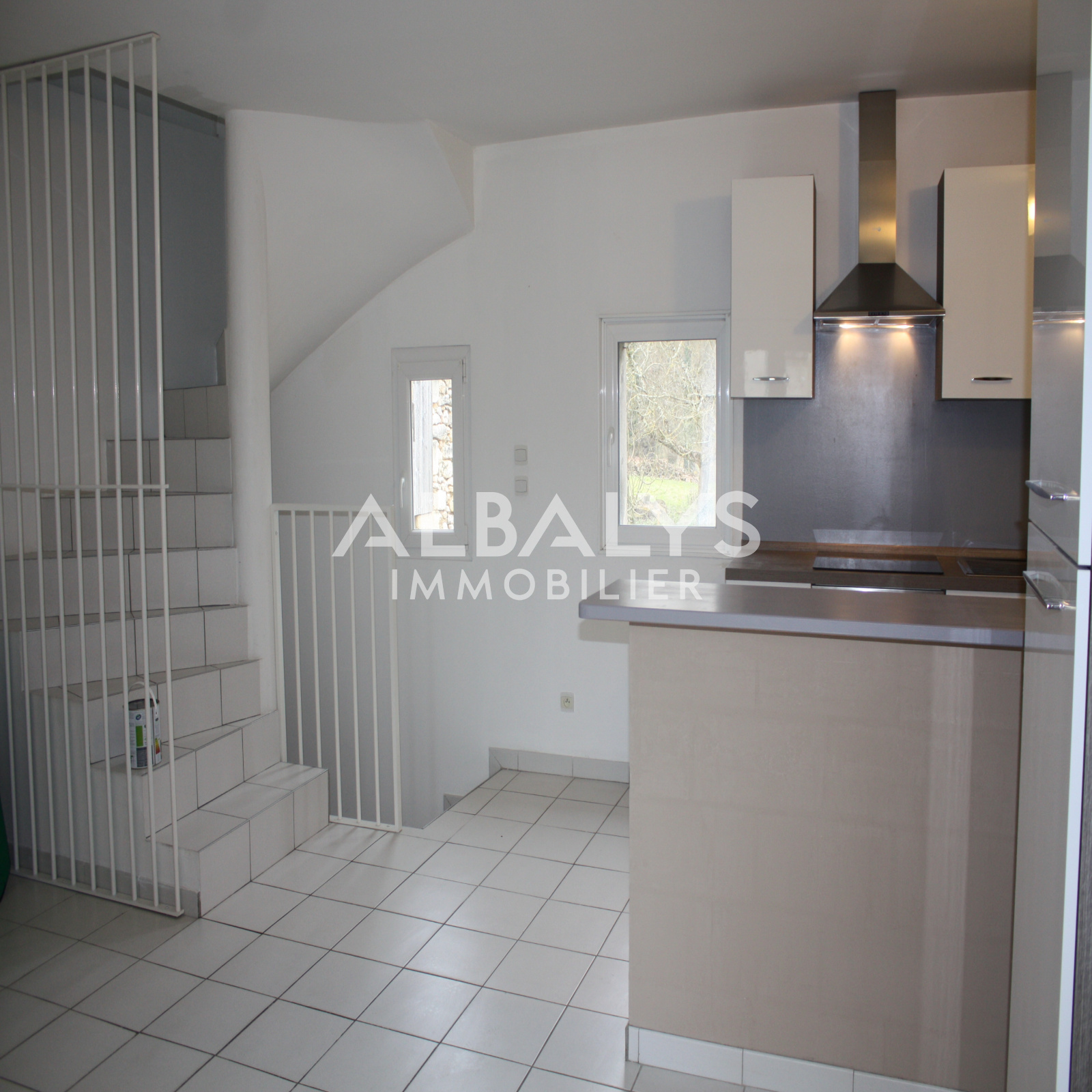 Niveau rue: salon/cuisine équipée 25m² (Frigo, plaque vitro, hotte, four)