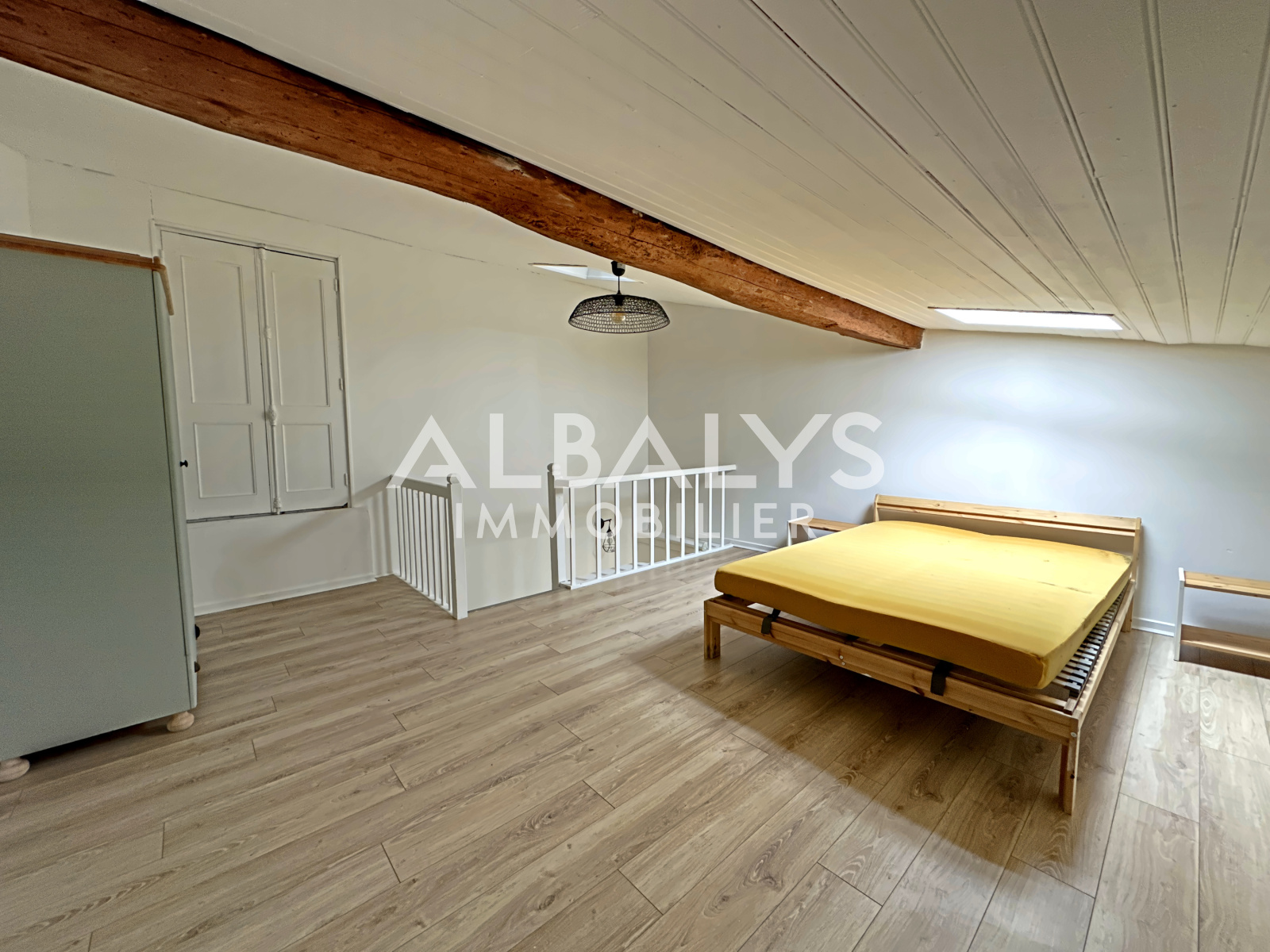À l'étage, on retrouve une chambre offrant un espace nuit cosy.