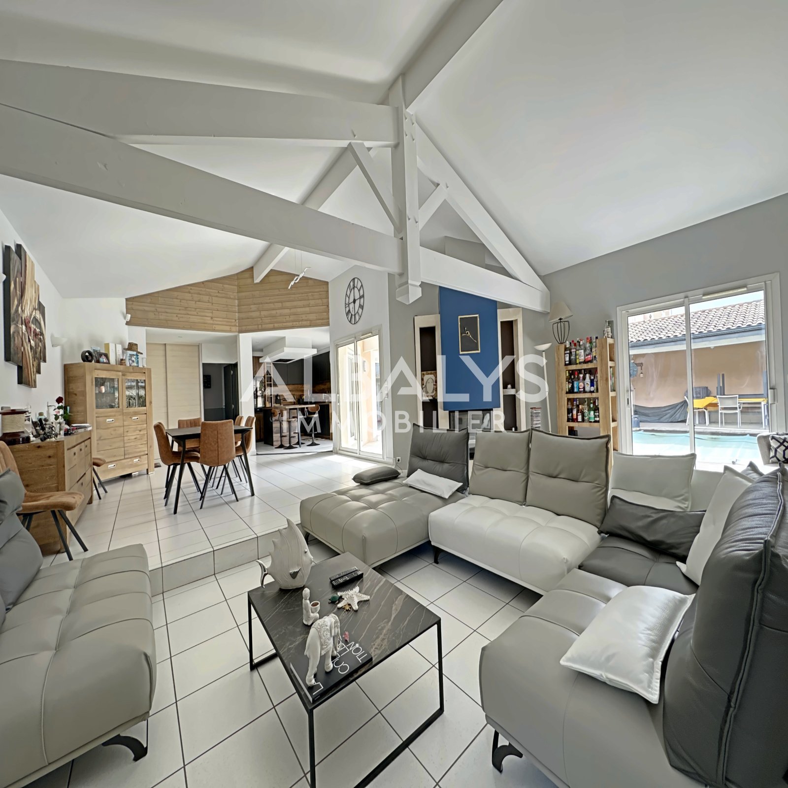 - Une cuisine ouverte sur salon-séjour d'environ 60 m2 lumineux possédant une cheminée avec insert.