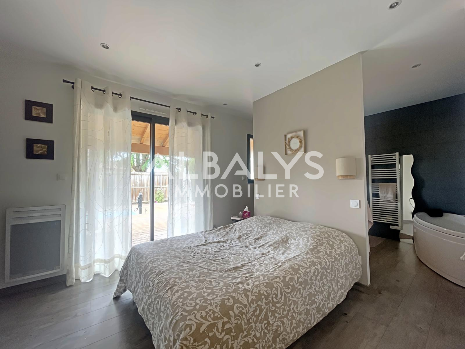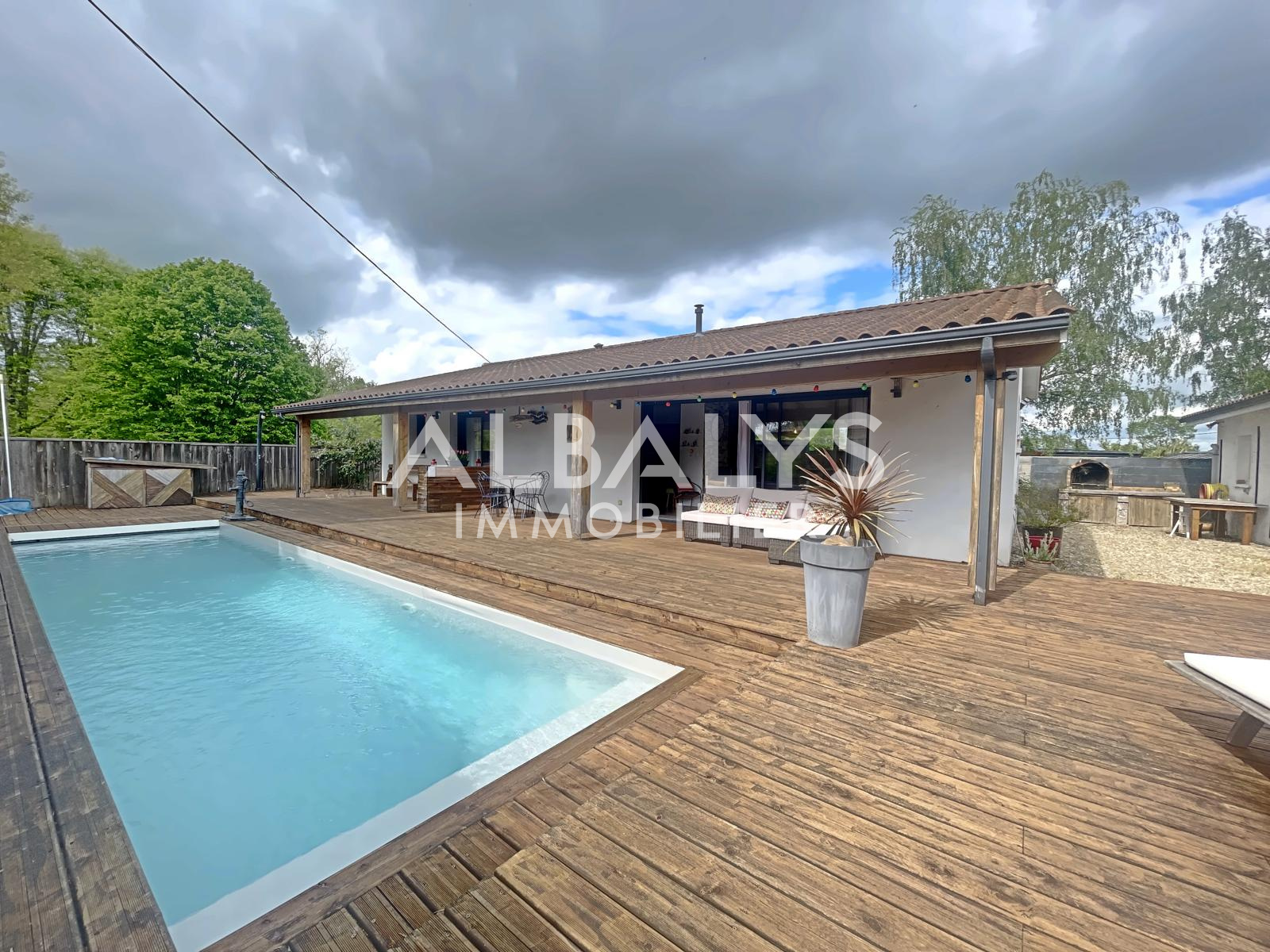 À l’extérieur, vous profiterez d’une grande terrasse en bois idéale pour vos moments de détente, accompagnée d’une piscine, parfaite pour les beaux jours.